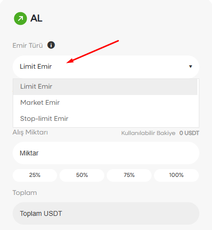 Kripto para alım-satım işlemleri sırasında, Bitcoin veya diğer kripto paraları alıp satmak için üç farklı emir tipi kullanabilirsiniz. Bu emir tipleri şunlardır: Limit, Market, Stop-limit emirleri.
