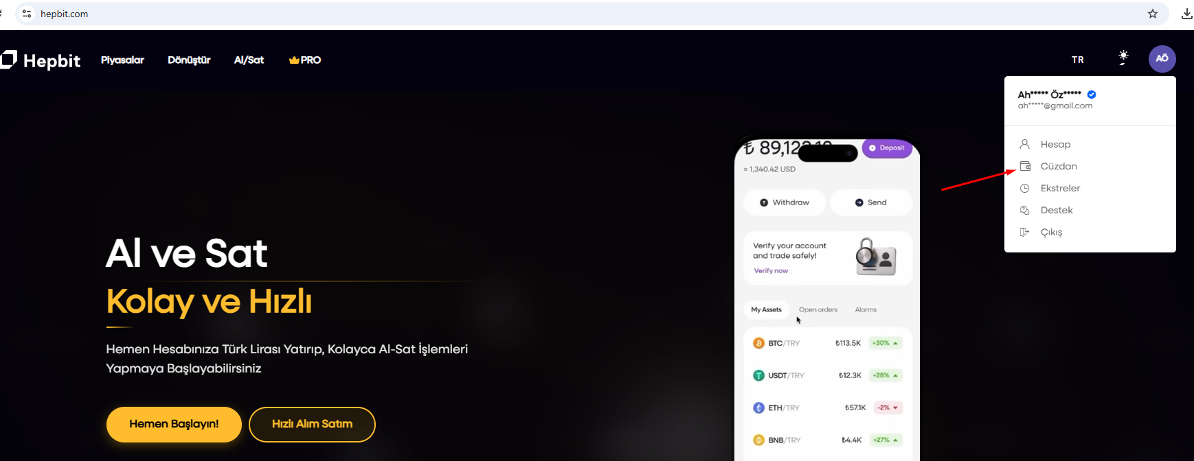 Menüde yer alan "Cüzdan" kutusundan Hepbit hesap bakiyenizi görüntüleyebilirsiniz.