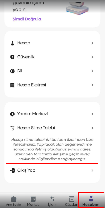 Alt menüde yer alan hesabım sekmesinden Hesap silme talebine ulaşabilirsiniz.