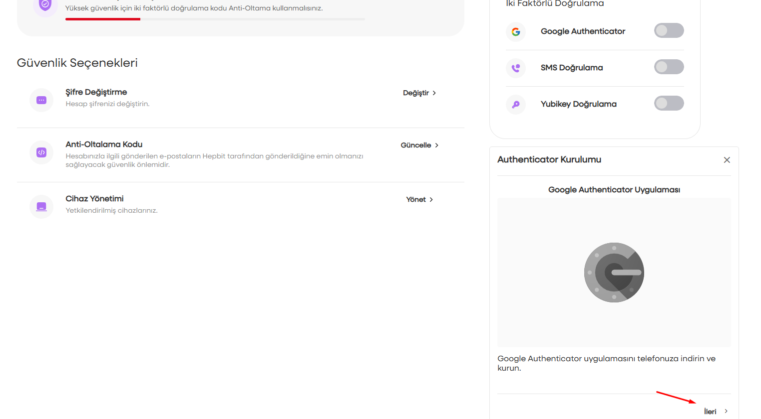 - Butonun alt kısmında açılan alandan ileri butonuna basarak QR kodun ve kurulum anahtarının görüntüleneceği bir sonraki sayfaya geçiş yapın.